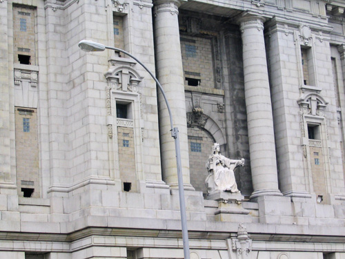 The courthouse, a compact four-story mass of smooth granite, is divided almost evenly between a deeply rusticated two-story base and an upper portion where piers, pilasters and tall windows rise to a cornice and attic story. A preliminary sketch shows a high dome and cupola, never built, which would have visually absorbed the upthrust and perhaps more satisfyingly resolved the relation of vertical and horizontal. To fit its site, the building is trapezoidal in plan, narrowing toward the side facing down Third Avenue. This façade is penetrated at ground level by a great arched portal scooped out of the heavy stonework. Above it, the façade retreats into a deep bay flanked by two colossal cylindrical columns, between which is poised Jules Eduard Roiné’s larger-than-life-sized marble statue of Justice. Behind her, on the rear wall of the recess, the arch of the lower portal is repeated as a window frame, surmounted by a lion’s-head keystone.