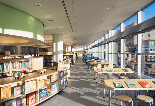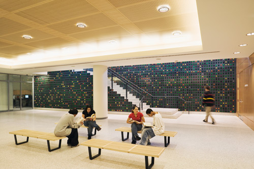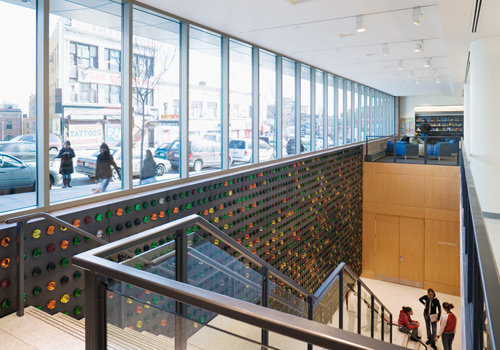 The library has a lot to offer the community with its: circulating collections; its 150-seat multi-purpose auditorium for programs and performances; community meeting space; Latino & Puerto Rican Cultural Center; teen center; children’s area; in depth reference materials; Internet-accessible and networked computers; technology training; computer-based instruction; and an outdoor reading terrace for fiction and non-fiction materials. A striking colored glass installation, built between the concourse level and the first floor, depicts the DNA sequence in artist Inigo Manglano-Ovalle’s “Portrait of a Young Reader.”