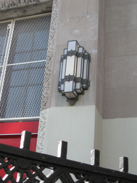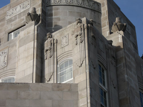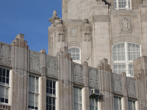 Flat walls and sharp outlines, however, give Ridder’s façades the feeling of paper cut-outs. Art Deco (named for an exposition of Arts Decoratif) was by nature a style of ornament, literally superficial, and architecture was only gradually finding ways of realizing its exciting shapes in solid volumes. Ridder’s solution is startling: a thick, tall exclamation point of an entrance tower that cuts across the vertex where the wings converge. In manner and material, the tower is in effect an independent structure. It rises straight up, a rectangular limestone block, following two wide piers on its face to a parapet at the fifth story. At this level, inducing a pause, heroic-sized sculpture appears —pilasters terminate in elongated maidens displaying books, stone urns rest on the ledge above the piers. Then, above the parapet, the tower abruptly changes shape, ending in a series of concentric cylinders, gradually flattened and terraced like a Babylonian ziggurat.