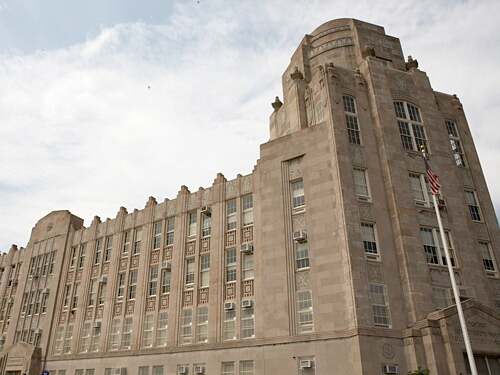 In September 1929, the new Superintendent of School Building Walter C. Martin, announced plans to build New York’s “first thoroughly modernistic school building.” Timid attempts had recently been made to apply geometric brickwork or angular sculpted figures to schools. But thoroughly modern Ridder Junior High School, like the newest buildings of Manhattan, aspired to give structural expression to one currently popular “modernism,” Art Deco.