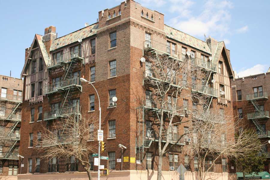 The Workers’ Cooperative Colony purchased land along Bronx Park East north of Allerton Avenue. The first house, completed in 1927, is accessed through a flowered, hedged and grassy courtyard. Off of it, there are several entrances, each one leading to a different section of the brick building. Each entrance is trimmed in terra cotta, on which each has a different molded motif. One of them displays a hammer on one side and a sickle on the other. On the exterior, the top floor and the roof end with a neo-Tudor half-timbered design. The second house, erected two years later, replicates the major elements of the original structure, but the neo-Tudor and the terra cotta designs were eliminated. From the beginning, residents called the complex, “The Coops” (not Co-ops).