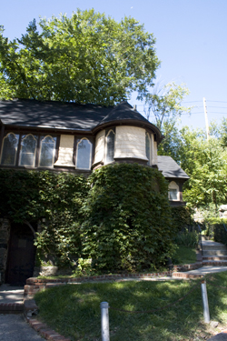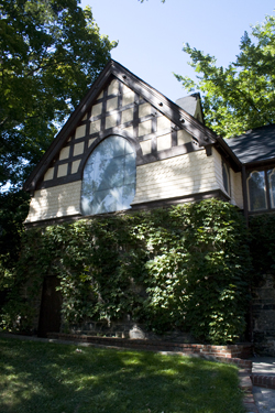 From the south-- the street-- side, Edgehill appears in texturally distinct layers: the undercroft’s high wall of random ashlars (vine-covered); then a one-story band of light-colored shingles (both rectangular and “fish-scale”), punctuated with narrow windows along the nave and transept arm; then a brow of eaves from which rises a dark shingle roof. On the south transept, the gable end is filled with brown-on-white cross timbering in a checkerboard pattern, with a large, pointed-arch stained glass window (by Tiffany) cut into it and the shingles below.