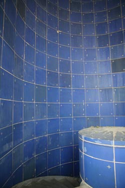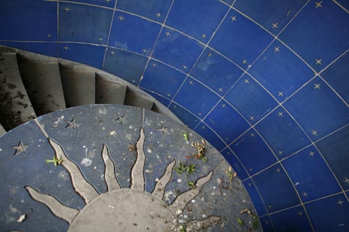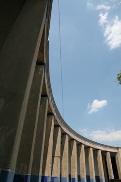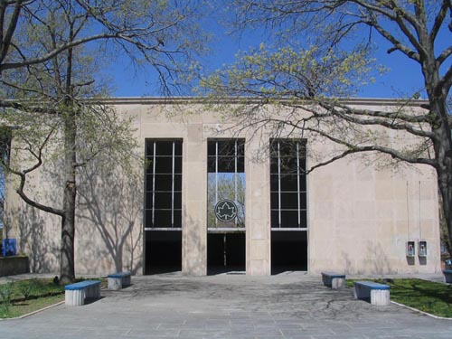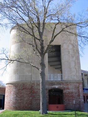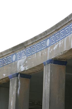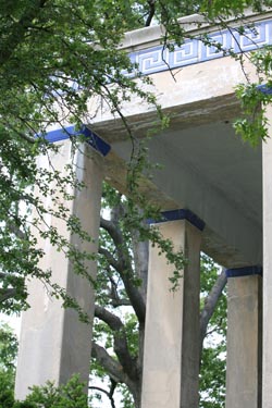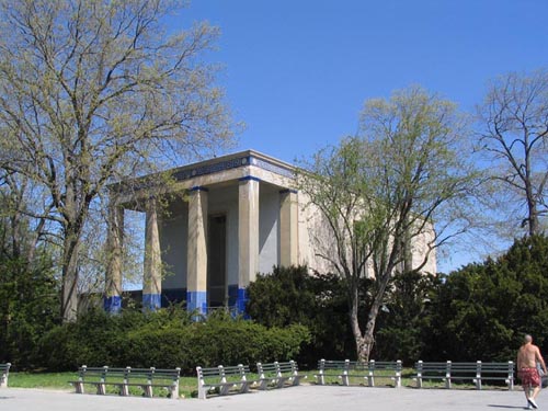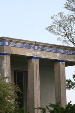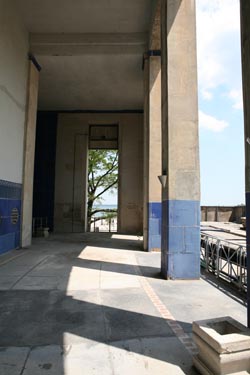 The Bathhouse is a two story curving structure that has concrete colonnades, embellished with blue terra-cotta tiles. Designed in a modern classical style, the Bathhouse is constructed of such economical materials as concrete, brick and limestone, along with tile and terrazzo. Central terraces on the upper level offer views of the waters of Long Island Sound, sailboats and flying seagulls. Looking west on the upper level while standing on the rose compass floor design, one can see the tall buildings of Co-op City.
