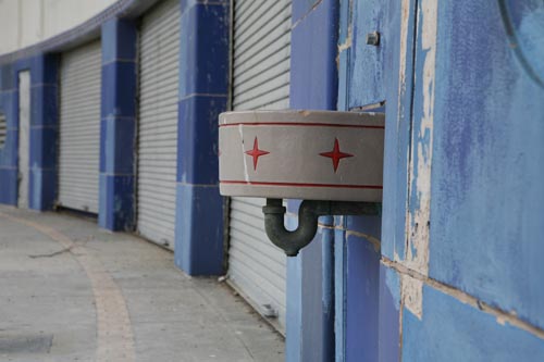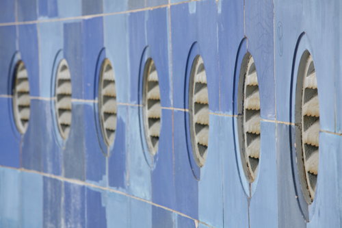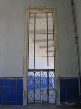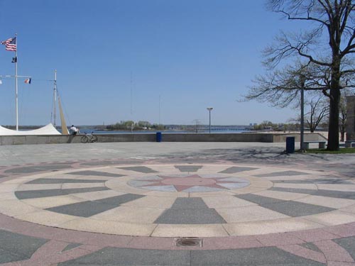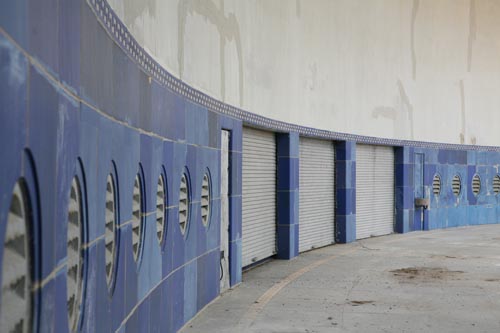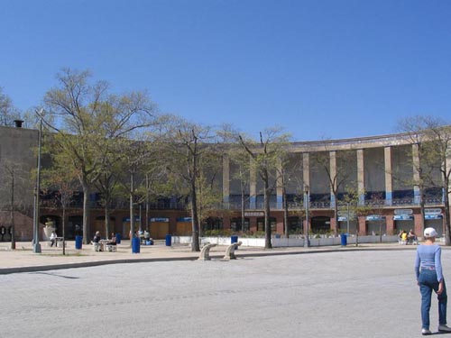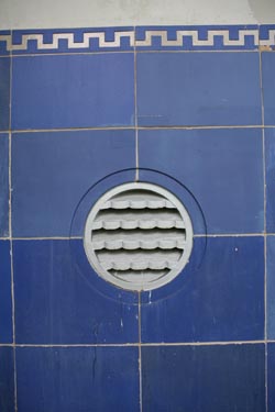 The long Promenade is paved with hexagonal blocks. This is edged with iron railings, benches, and vent portholes using a nautical motif. The plaza is concave and a large terrace is set off against the curved colonnades of the Bathhouse.