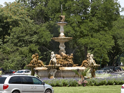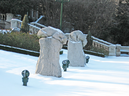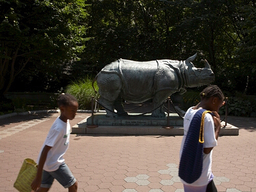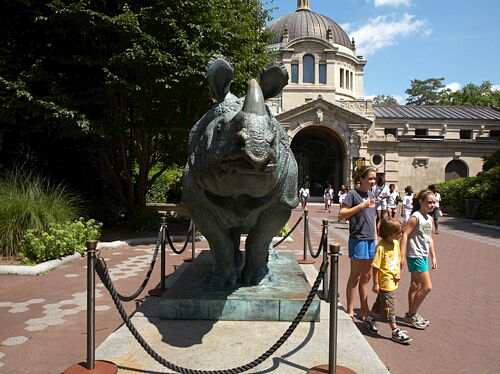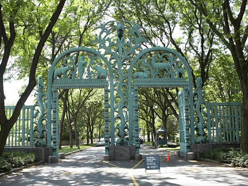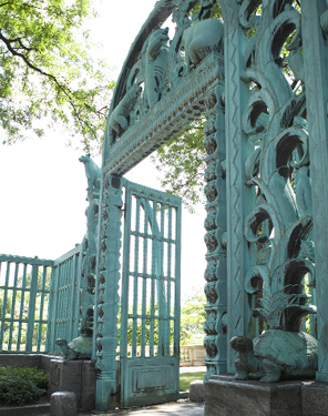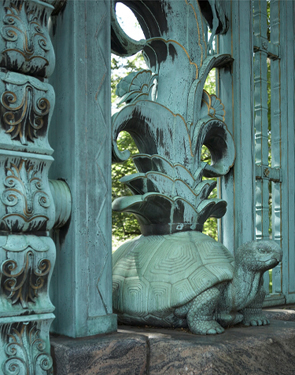The best known sculpture is not on Astor Court but at the Pelham Parkway entrance, where the Paul J. Rainey Memorial Gateway designed in 1926 by the well-known sculptor Paul Manship was installed in 1934. Made of bronze that over the years has turned a light sea green, the gates are a fantastic structure with two openings surmounted by openwork lunettes and bounded by tree like forms. Around the whole, some 22 different animals, including some former Zoo celebrities—Buster the giant Galapagos tortoise, Jimmy the Shoe bill stork, and Sultan the African lion—are used as decorative motifs.