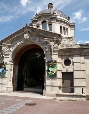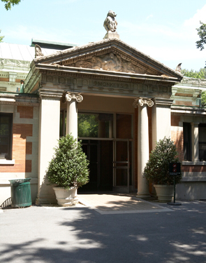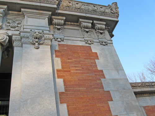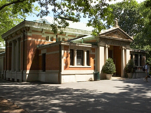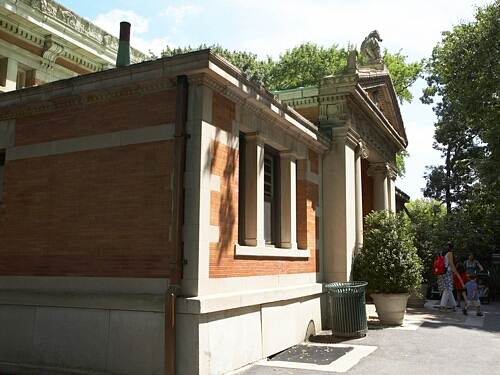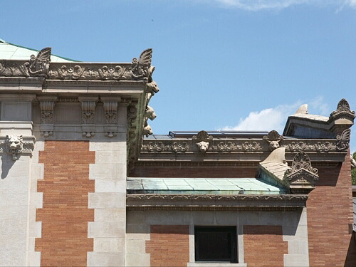The result was Baird Court, begun in 1900 and finished within the decade, conforming (on its extremely small scale) to the “formality” of contemporary urban planning. Like the National Mall of the 1901 McMillan Plan for Washington, D.C., the court is organized as a vista framed by stylistically similar buildings with a uniform cornice line, and focused on a domed edifice. A raised rectangular terrace reaches southward from inside the Fordham Road gate (once the main entrance for carriages and motorcars), its central axis passing over lawns set between parallel tree-bordered walks. Symmetrically positoned on either side of this mall are handsome orange brick, limestone trimmed buildings with sloping roofs and heavy cornices. A square-plan Administration Building faces the L-shaped Bird House at the north end, with rectangular “Monkey” (actually Primate) and Lion Houses to the south. (The ”National Collection of Heads and Horns,” on the east side, is a later addition.) Architects Heins and LaFarge (who also designed the stations for New York’s new subway) have positioned/organized their buildings with an eye to the flow of crowds. The animal houses align their long sides with the axis of the court, but have entrances only at the narrow ends. The uninterrupted mall-facing exteriors of the lion and birds house are covered with cages. (Nervous monkeys were considerately exposed at the back side of their building.) Each of the four brick buildings is provided with a different version of a classical portico with columns and pilasters. Each is, to a different degree, ornate. The same Beaux Arts esthetic which expected symmetry and focus in plans had a taste for ripe embellishment on facades, as long as the decoration was nominally “classical.” So the houses are elaborated--in the case of the Lion House, encrusted-- with ancient and Renaissance devices: antefixes, cartouches, dentils, eggs-and-darts, and so on.
