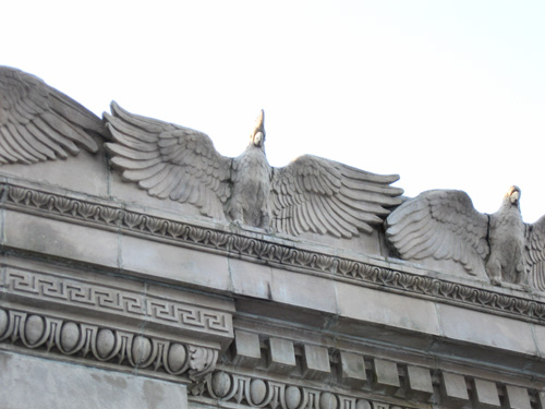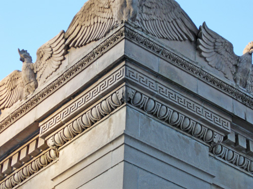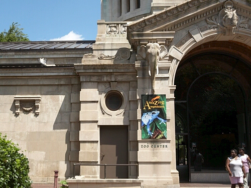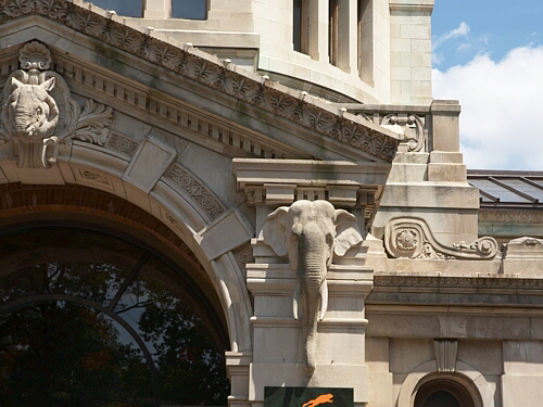 All the animal houses of the court make use of the work of so-called animaliers, sculptors who specialize in the accurate representation of fauna. The popularity of such pieces peaked in the late nineteenth-century, when America celebrated the survival of the fittest with lawn-sculptures of fighting beasts, and mourned the lost frontier with table-top bison and elk. The Zoological Society was committed to advancing the art, providing, for example, a “studio cage” in the Lion House where animaliers could work from live models, undisturbed by the public. And the classical features of the Heins and LaFarge buildings offered plenty of surfaces and platforms for sculptural decoration. Thus we find the foliated frieze of the primate house occupied by monkeys in low-relief, realistically distinguished by species, and an orangutan patriarch surrounded by his family lodged in the triangular tympanum. The cornice of the Lion House bulges with 38 high-relief heads of pumas, jaguars, leopards and lynx, the work of animalier Eli Harvey. He also provided the Lion House, the largest and most heavily ornamented of the forecourt buildings, with terracotta plaques from which burst seven startling life-sized lion, lioness, and tiger heads, most with jaws gaping in full roar. Their realism and animation is surely meant to contrast with traditional leonine ornament appearing elsewhere on the building: a lion spouting water in a fountain, lion-head fixtures with rings in their teeth, the pair of guardian lions at the sides of the north portico. A different interplay between realism and convention appears in three buildings featuring the work of A. Phimster Proctor, perhaps the country’s leading animalier. Proctor’s animals seem to have a penchant for taking the place of architectural elements. What appear at first to be acroteria on the Monkey House, abstract decorations standing on the apices of its classical pediments, reveal themselves to be free-standing life-sized sculptures of Hamadryas Baboons in characteristically watchful sitting positions. The sculpted elephant heads beneath the architrave of the Elephant House are not portrayed, as in some Eastern architecture, upholding the burden of the masonry. Instead, their trunks curve out and down in an elegant S, coming to rest on the wall in a naturalistic imitation of a “console,” a scrolled support bracket (which Heins and LaFarge have employed on all the other buildings of the court). Most inventive of all is the cornice of the Bird House, where upright cockatoos in a high-relief row alternate raised and lowered wings and crests, producing an avian version of a wave-patterned frieze (and, incidentally, what might be called a zoetrope sequence of beating wings). Perhaps unintentionally, the animaliers encourage nature to infiltrate the cityscape of Baird Court, and subvert some of its architectural dignity.