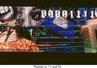 Fekner contemplates first love in the work Melody in 1's and 0's by conceptualizing the stream of consciousness within a child's mind as he composes a love sonnet. Various images such as a girls' fleeting glance, musical notes and digital code appear to move and converge, then fly apart.