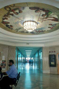 Striving to include historical figures often overlooked by curriculum into The Call, Walton Ford incorporated images of such notable people as Dr. Charles Drew (who dese- gregated the Red Cross blood supply); entrepreneur Madame C.J. Walker; civil rights activist Rosa Parks; and painter Frida Kahlo on to the circular ceiling in the lobby. The figures appear to be reaching out to the viewer as if to assist or uplift them. In the auditorium, Walton Ford uses the images of Artemis, Horus, and Ixchel to represent different cultures and traditions coming together in two murals known collectively as Inside-Out.