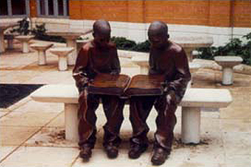 The Greek epics, The Iliad and The Odyssey, served as inspiration for the series of works Murals and Sculptures. The theme revolves around one of introspection...that is, to see within oneself what led to the present situation and ways to overcome challenges in daily life. The sculpture at the inner courtyard portrays the characters of Achilles and Odysseus. The sculptures are represented as two similar figures, dressed in contemporary clothes and reading books with quotes pertaining to each. It can be said that they embody two different sides of the human psyche-one able to overcome adversity while the other is consumed by its own rage. The reading of books might suggest the idea that knowledge is empowering and that these individuals are seeking empowerment through learning. The paintings in the lobby depict a shield, a series of wings, and the impression of everyday people glued onto pages torn from The Odyssey. They appear to also ask the viewer to take a different perspective on life and to gain hope.