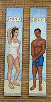 The four mosaic plaques which comprise Mind, Health, Spirit, Body represent various members of the student body against a blue background and upon a platform. These images were designed around a swimming motif with the intention that they be placed near the Walton High School swimming pool. They are currently mounted in the school gymnasium until completion of the swimming pool renovation.