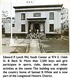 Samuel B. White's estate, Longwood Park, stood north of Hunts Point: his former residence is today by the Police Athletic League center on 156th Street. In the late nineteenth century, Longwood and neighboring holdings were subdivided into residential lots. The Longwood Historic District preserves some of the row houses built between 1897 and 1901.