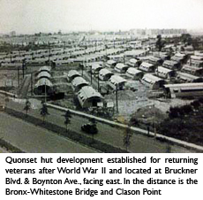 This section, once the site of an Indian settlement, lies along the east side of the Bronx River (and far from any view of the "Sound"). Its residential life developed in two stages. In the 20s, the Westchester Avenue IRT brought tenement refugees to the "East Bronx" and its modest houses. In the 60s, the Bruckner Expressway, a heavily-traveled east-west link, was soon bordered by the towers of housing projects. (Soundview Park, a ninety-three acre tract owned by the city, has thus far been used only for temporary housing, as our picture shows.)