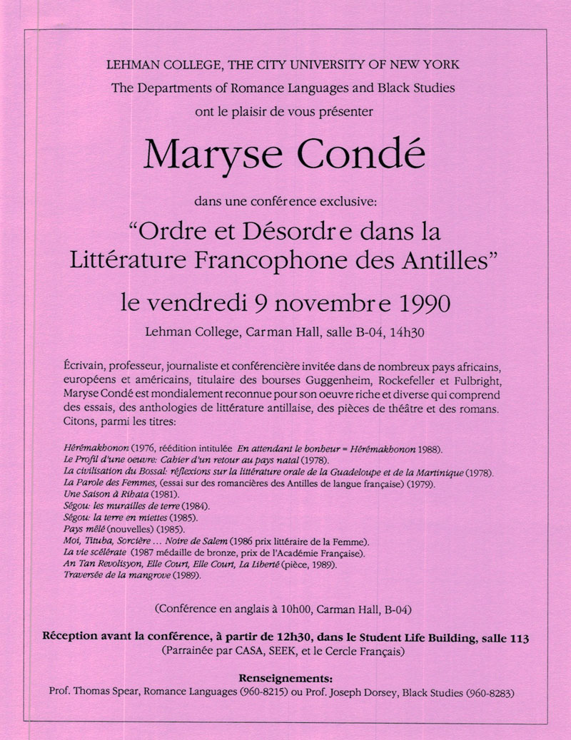 - Maryse Condé, Guadeloupean critic and writer, "The Metamorphosis of Africa in French Caribbean Writing," and "Ordre et Désordre dans la Littérature Francophone des Antilles," 9 November 1990. (videos available in Lehman Library