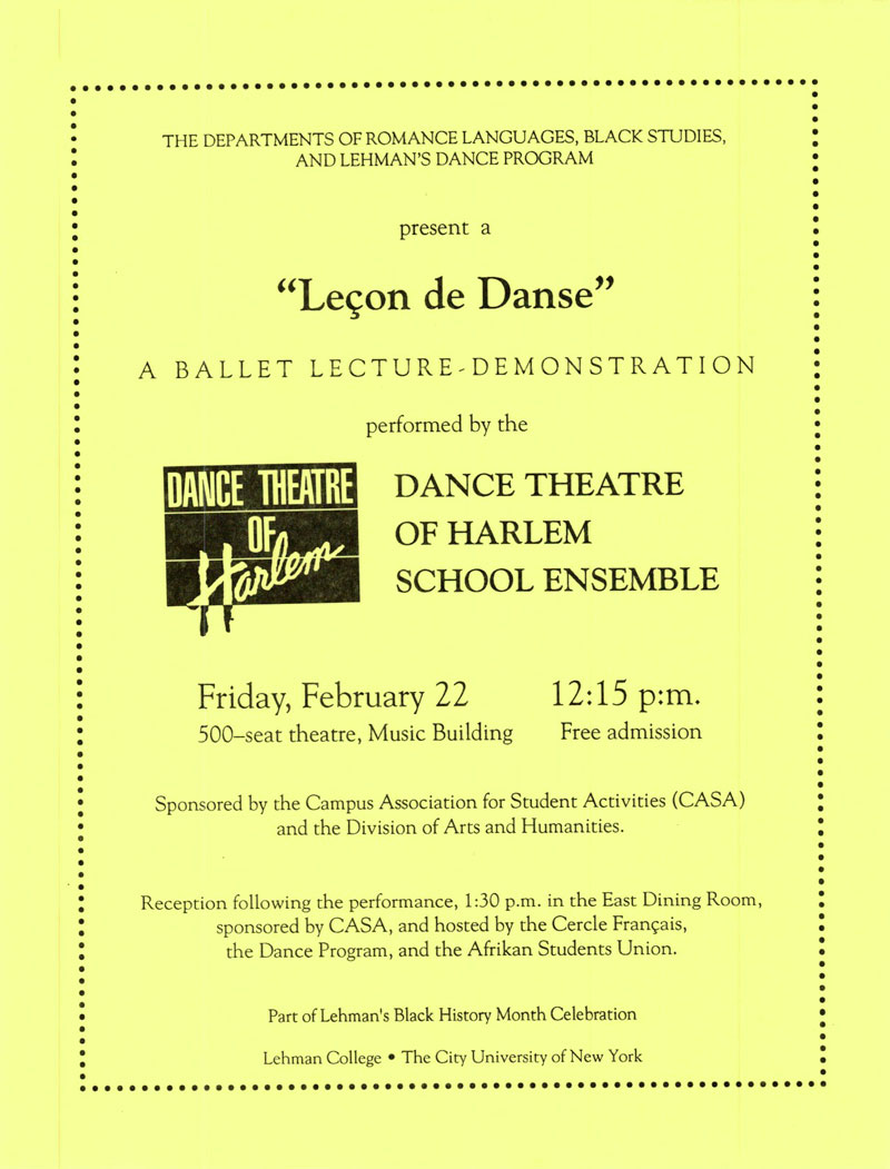 - The Dance Theatre of Harlem School Ensemble performed a special "Leçon de Danse" lecture-demonstration in French and English, 22 February 1991. [flyer JPG]