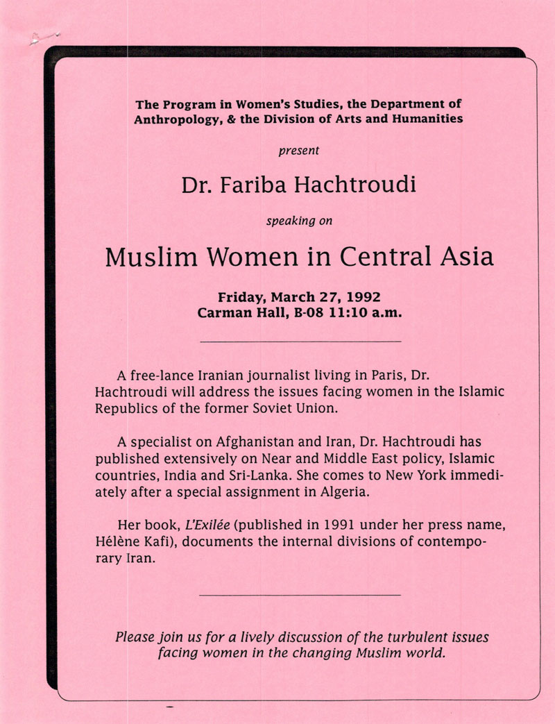- Fariba Hachtroudi, Paris-based Iranian journalist and writer, "Muslim Women in Central Asia" and "Le Journalisme clandestin," 27 March 1992. [Eng flyer JPG – Fr flyer JPG]