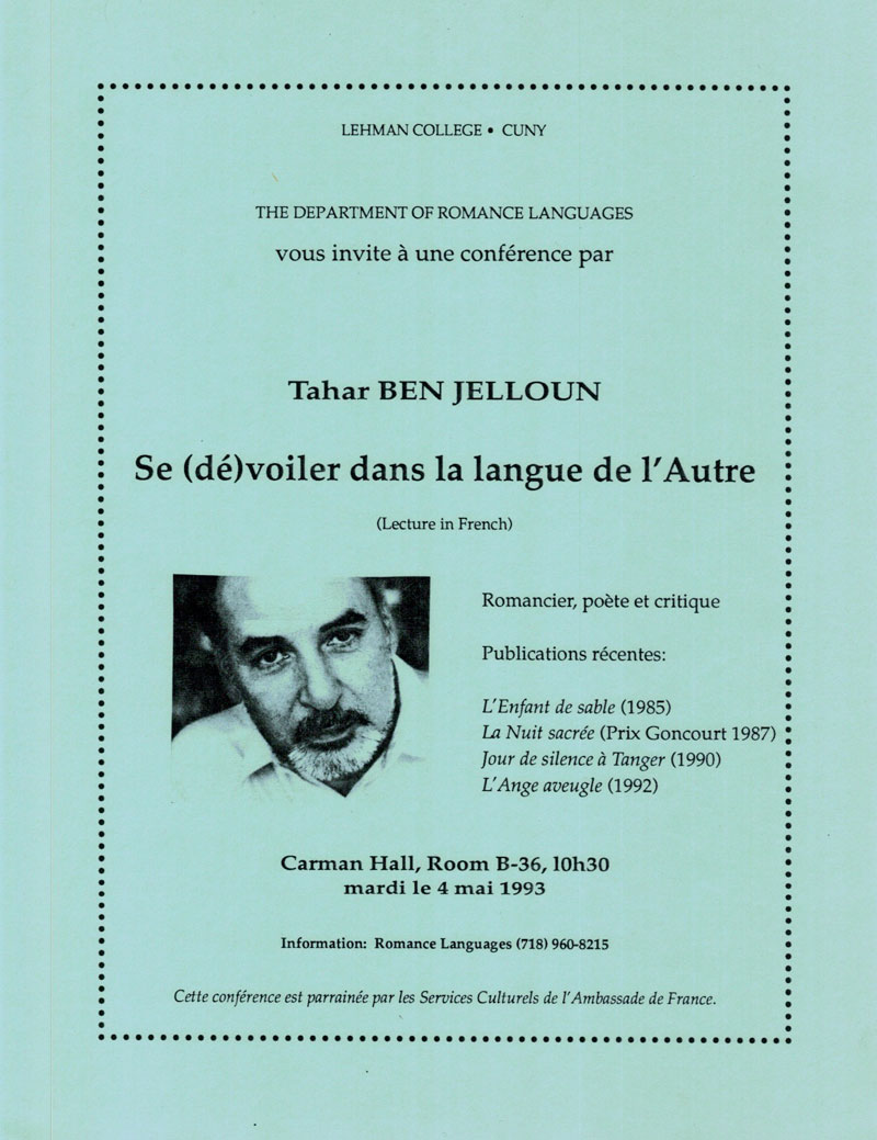 - Tahar Ben Jelloun, French-Moroccan author, "Se (dé)voiler dans la langue de l’Autre,". 4 May 1993. (video available in Lehman Library