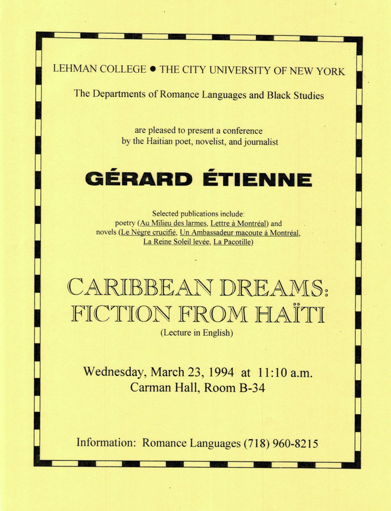 - Gérard Etienne, Haitian poet and author, "Caribbean Dreams, Fiction from Haïti," 23 March 1994. [flyer JPG]