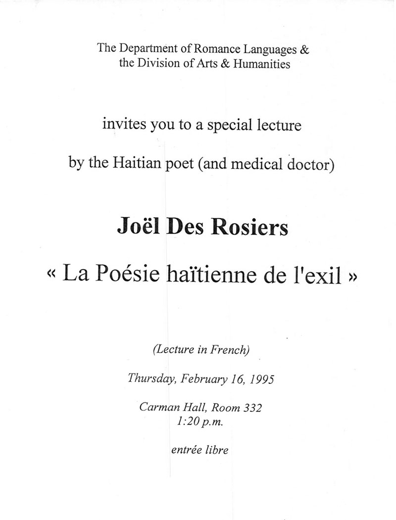- Joël des Rosiers, Haitian-Québécois psychiatrist, essayist and poet, "La Poésie Haïtienne de l’exil," 16 February 1995. [flyer JPG]