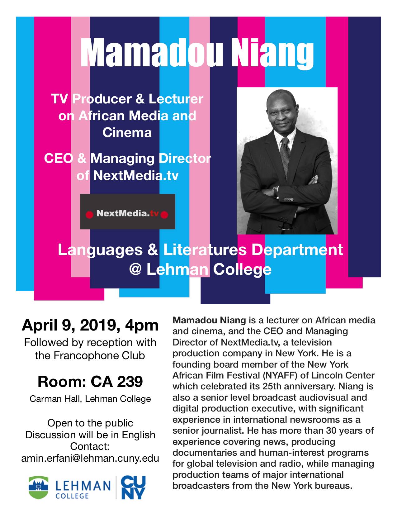 - Mamadou Diang, TV Producer & Lecturer on African Media and Cinema, 9 April 2019. [flyer JPG]