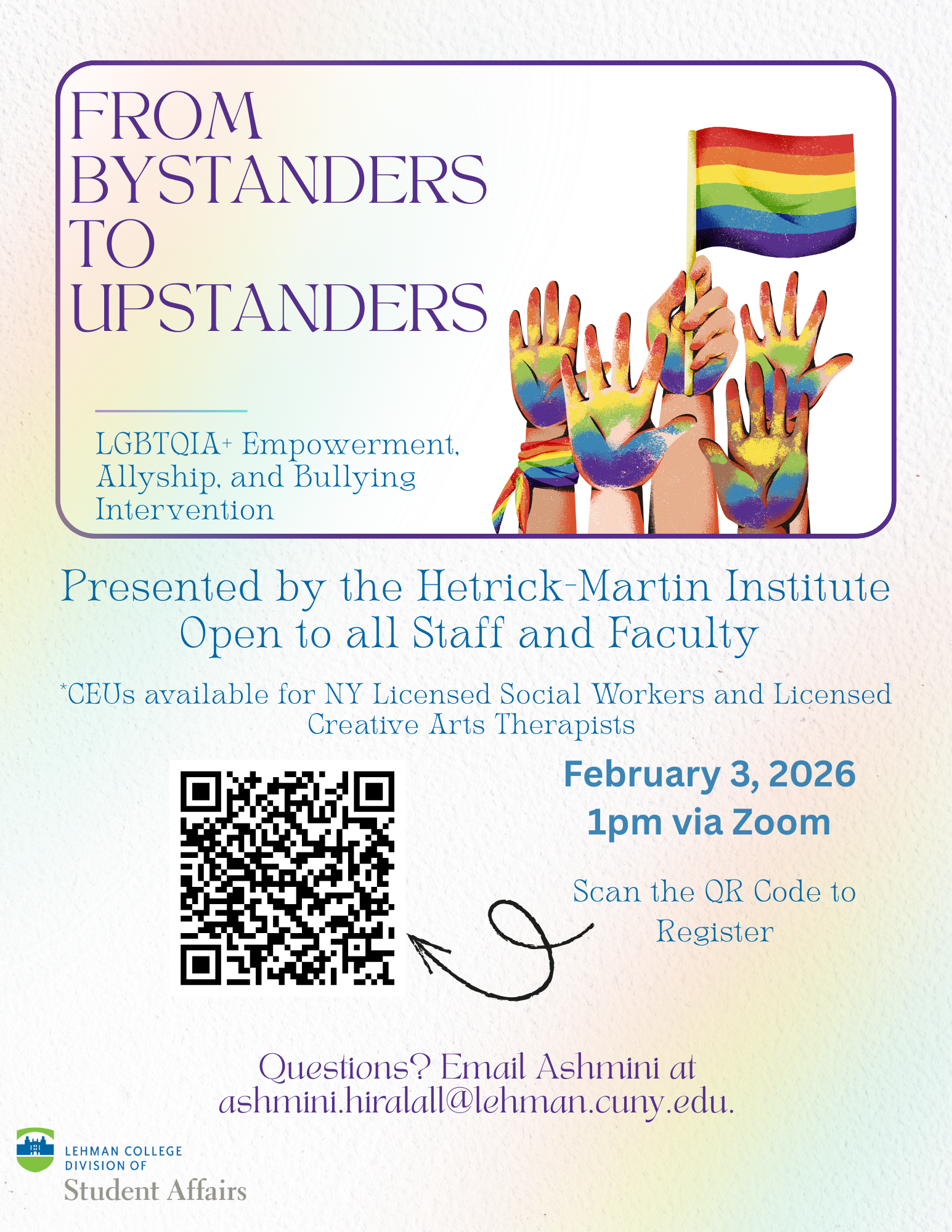 At this critical time, learning how to support our community is essential to promote wellbeing and safety. Please join us for "From Bystanders to Upstanders: LGBTQIA+ Empowerment, Allyship, and Bullying Intervention" on February 3, 2026, at 1pm. This workshop presented by the Hetrick-Martin Institute will discuss how to become an upstander to support our community.