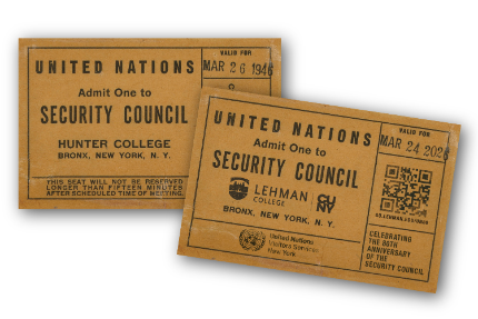 The original ticket used by the public and an updated facsimile, which was given to Security Council members (original courtesy of the United Nations)