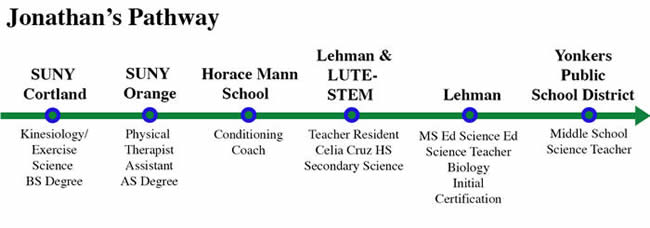 Jonathan chose Lehman College because it offered him a pathway to become a teacher while not taking on exorbitant debt. He didn’t initially realize all of the opportunities that would come along with that decision. While at Lehman, Jonathan had two defining experiences. The first was his experience in the LUTE-STEM program. Being accepted in that program gave him the opportunity to obtain real-world teaching experiences while providing financial support to complete his degree. Jonathan credits this program with helping him to prepare for the demands of his new teaching career.