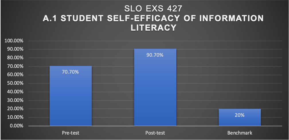 Bar graph titled 'SLO EXS 427 A.1 STUDENT SELF-EFFICACY OF INFORMATION LITERACY'. The graph has three vertical bars representing 'Pre-test', 'Post-test', and 'Benchmark'. The 'Pre-test' bar shows 70.70%, the 'Post-test' bar shows a significant increase at 90.70%, and the 'Benchmark' bar is much lower at 20%. Each bar is a different shade of blue on a dark background, with percentage values labeled on top of each bar. The y-axis is labeled with percentages ranging from 0.00% to 100.00%, in increments of 10.00%.