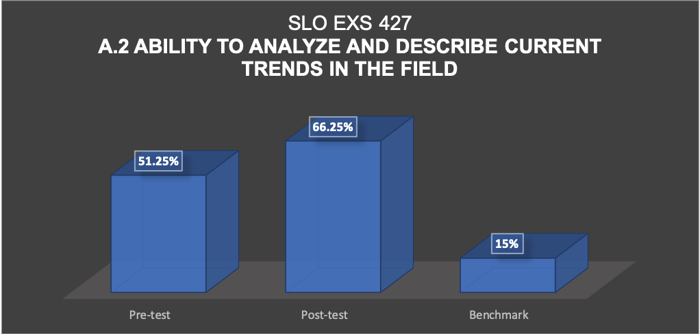 3D bar graph titled 'SLO EXS 427 A.2 ABILITY TO ANALYZE AND DESCRIBE CURRENT TRENDS IN THE FIELD'. The graph displays three dimensional bars for 'Pre-test', 'Post-test', and 'Benchmark'. The 'Pre-test' bar is at 51.25%, depicted on the left side, the 'Post-test' bar in the center is higher at 66.25%, and the 'Benchmark' bar on the right is at 15%. Each bar is blue and has its corresponding percentage value labeled on its top surface. The background is dark, and the perspective gives a three-dimensional look to the bars.