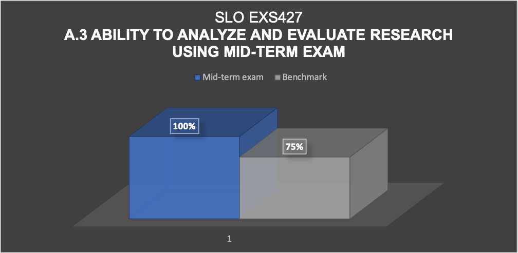 3D bar graph titled 'SLO EXS427 A.3 ABILITY TO ANALYZE AND EVALUATE RESEARCH USING MID-TERM EXAM'. The graph features two three-dimensional bars labeled 'Mid-term exam' and 'Benchmark'. The 'Mid-term exam' bar is colored blue, significantly taller, and indicates a 100% level. The 'Benchmark' bar is gray and stands at 75%. Both percentages are displayed on the top of the respective bars. The graph has a dark background, and there's a light source creating subtle shadows to the right of the bars, enhancing the 3D effect.