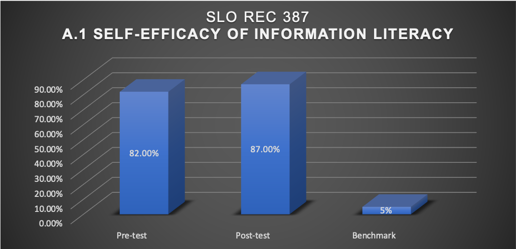 3D bar graph titled 'SLO REC 387 A.1 SELF-EFFICACY OF INFORMATION LITERACY'. The graph shows three vertical bars representing 'Pre-test', 'Post-test', and 'Benchmark'. The 'Pre-test' bar shows an 82.00% level, the 'Post-test' bar shows an increased level of 87.00%, and the 'Benchmark' bar is much lower at 5%. Each bar is blue and the percentages are labeled at the top of the first two bars. The background is dark with a grid, and the y-axis is labeled with percentages from 0.00% to 90.00% in increments of 10.00%.