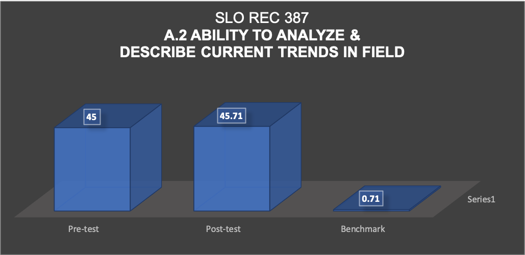 3D bar graph titled 'SLO REC 387 A.2 ABILITY TO ANALYZE & DESCRIBE CURRENT TRENDS IN FIELD'. The graph presents three dimensional bars for 'Pre-test', 'Post-test', and 'Benchmark'. The 'Pre-test' bar shows a score of 45, the 'Post-test' bar slightly higher at 45.71, and the 'Benchmark' bar significantly lower at 0.71. The bars are depicted in shades of blue, with the scores labeled on top of the 'Pre-test' and 'Post-test' bars, and on the front face of the 'Benchmark' bar. There is a label 'Series1' next to the 'Benchmark' bar. The background is dark grey, and the bars are placed on a lighter grey floor, giving a floating effect to the graph.