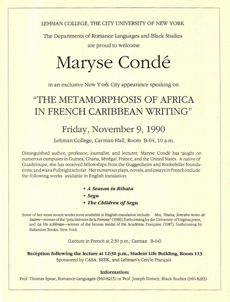- Maryse Condé, Guadeloupean critic and writer, "The Metamorphosis of Africa in French Caribbean Writing," and "Ordre et Désordre dans la Littérature Francophone des Antilles," 9 November 1990. (videos available in Lehman Library