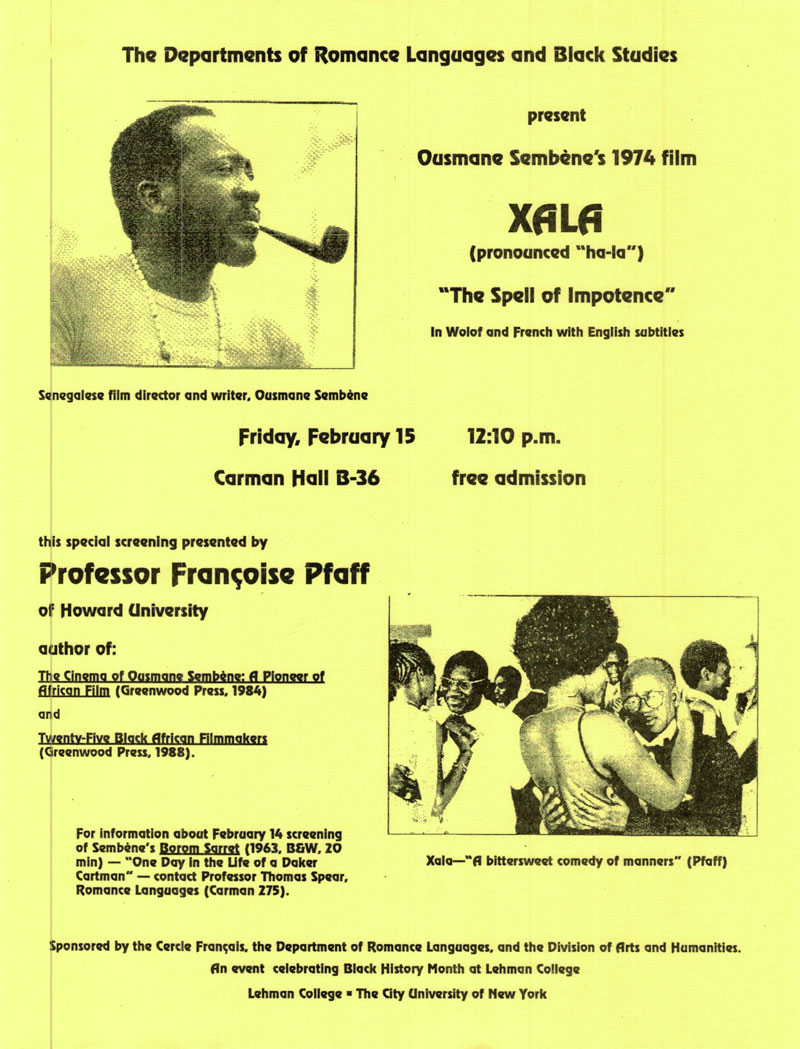 - Screening of Xala, feature film by Sembène Ousmane, with lecture presentation by Françoise Pfaff, African film and literature specialist, 15 February 1991. [flyer JPG]