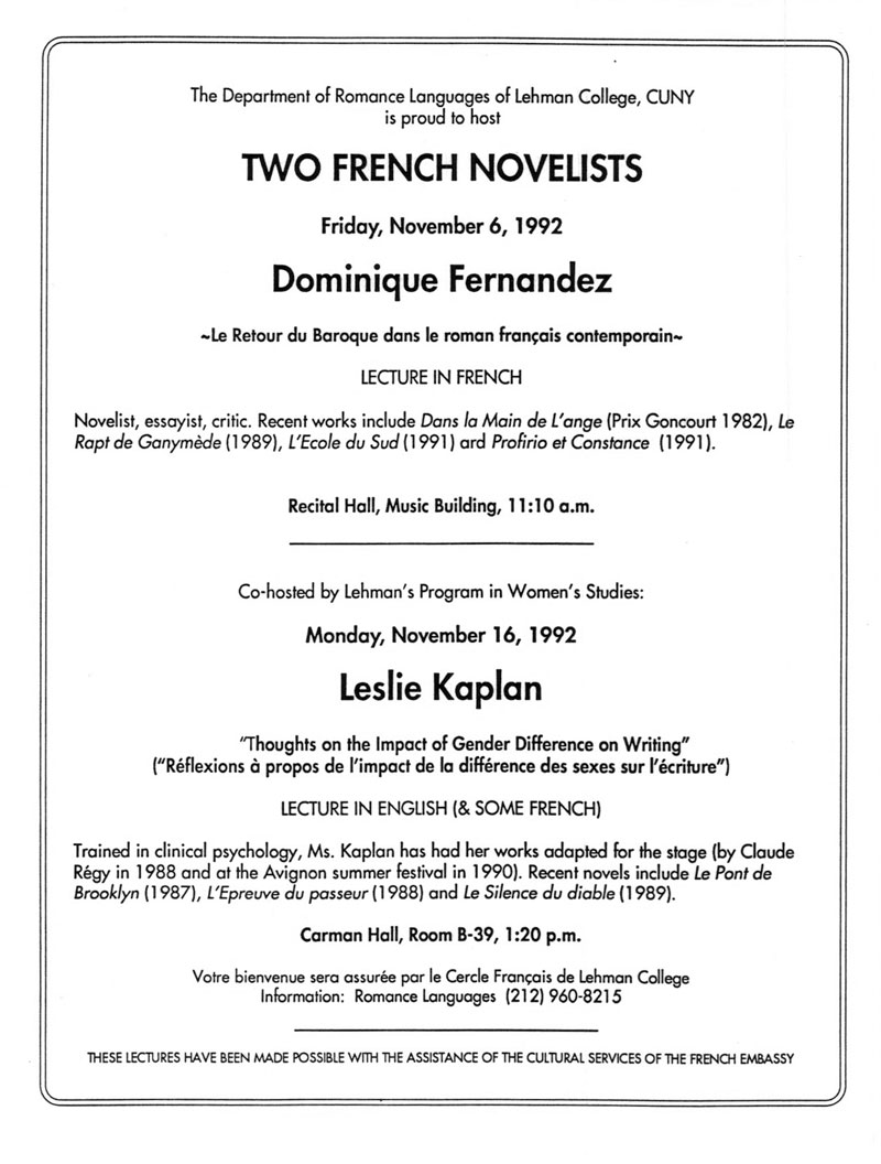 - Leslie Kaplan, French writer, "The Impact of Gender Difference on Writing," 16 November 1992. [flyer JPG]