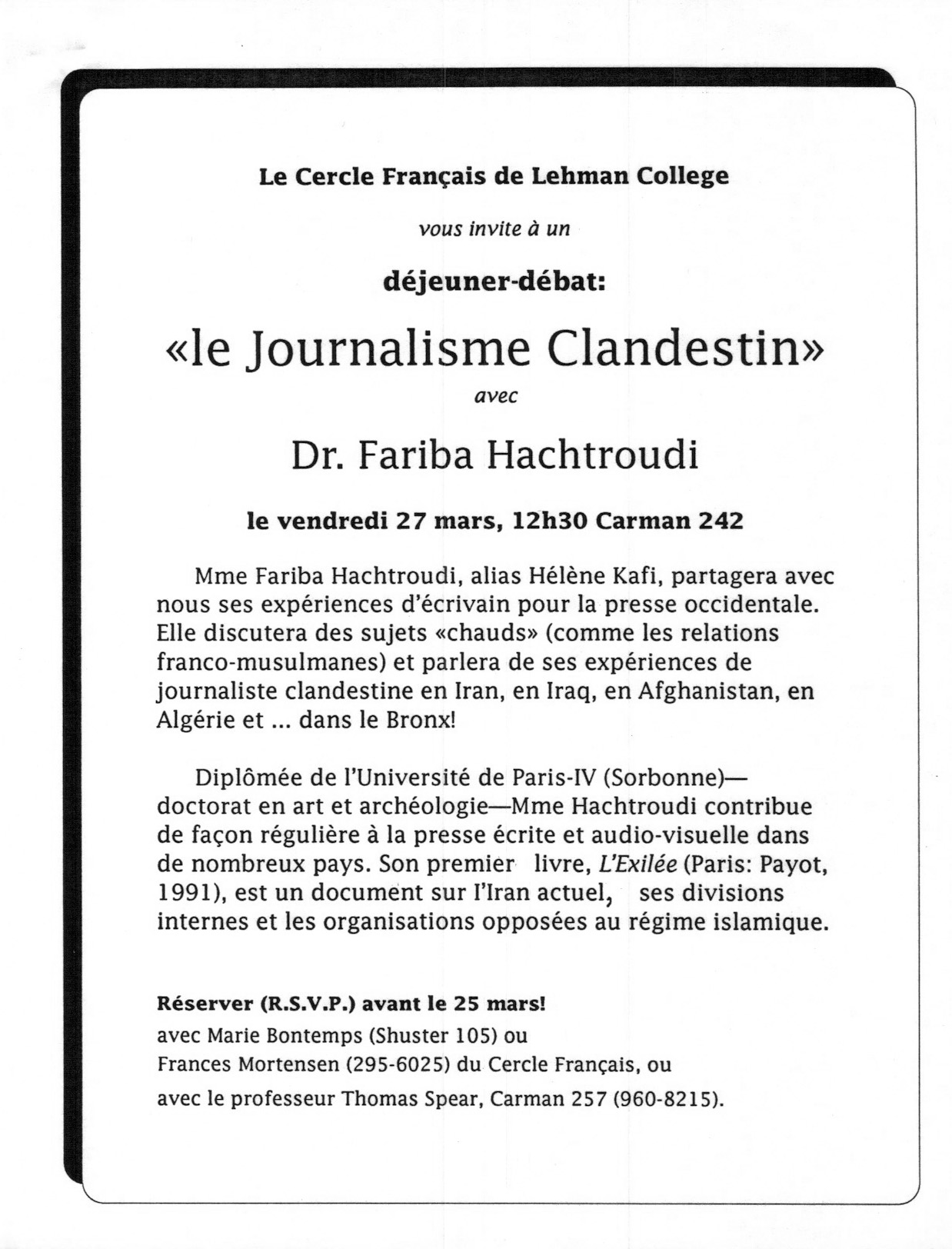 - Fariba Hachtroudi, Paris-based Iranian journalist and writer, "Muslim Women in Central Asia" and "Le Journalisme clandestin," 27 March 1992. [Eng flyer JPG – Fr flyer JPG]