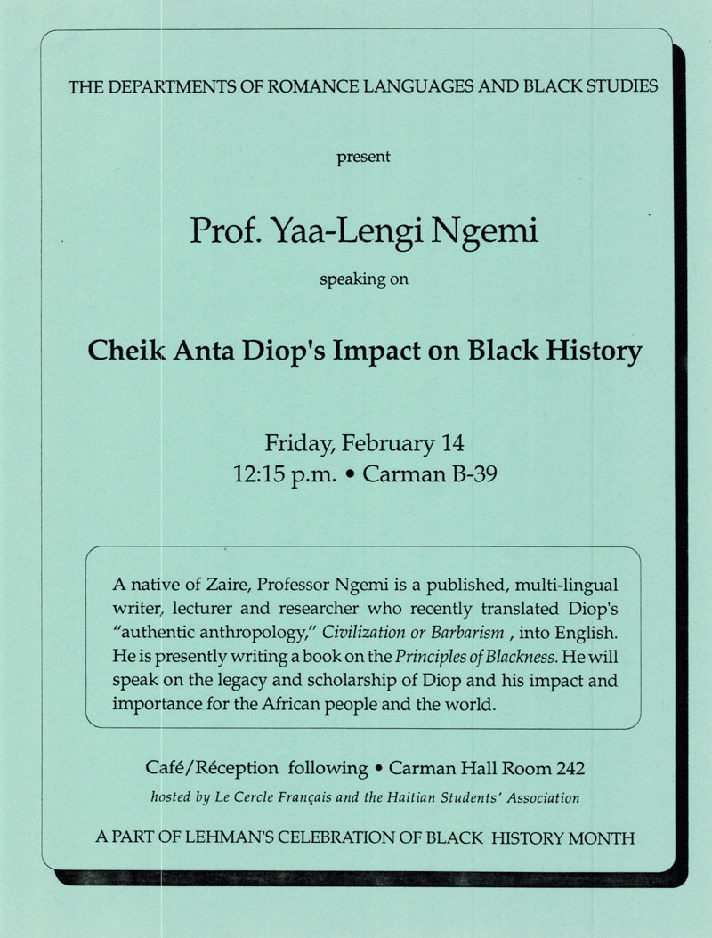 - Yaa-Lengi Ngemi, Zaïrois translator and musician, "Cheik Anta Diop’s Impact on Black History," 14 February 1992. [N.B. La République démocratique du Congo was known as Zaïre when this lecture was held.] [flyer JPG]