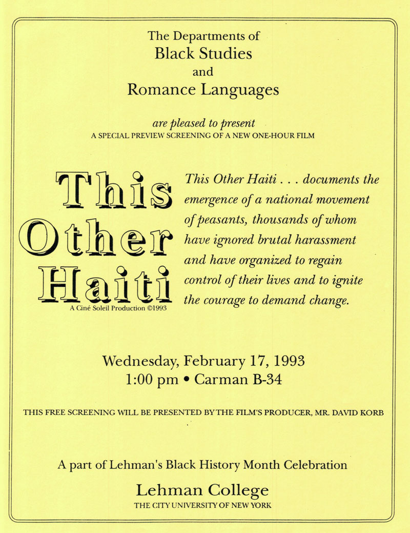 - Preview screening of This Other Haiti, a Ciné Soleil film, presented by its producer, David Korb, 17 February 1993. [flyer JPG]