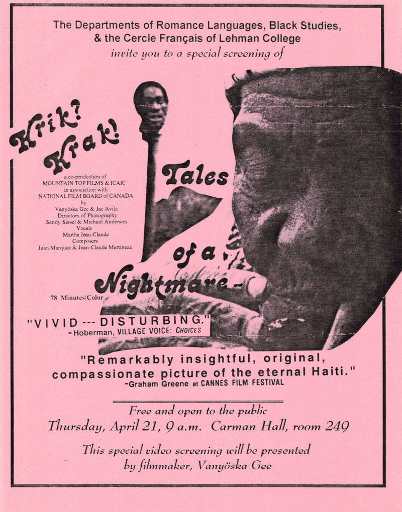 - Screening of Krik? Krak! Tales of a Nightmare documentary film on Haiti presented by filmmaker Vanyöska Gee, 21 April 1994. [flyer JPG]