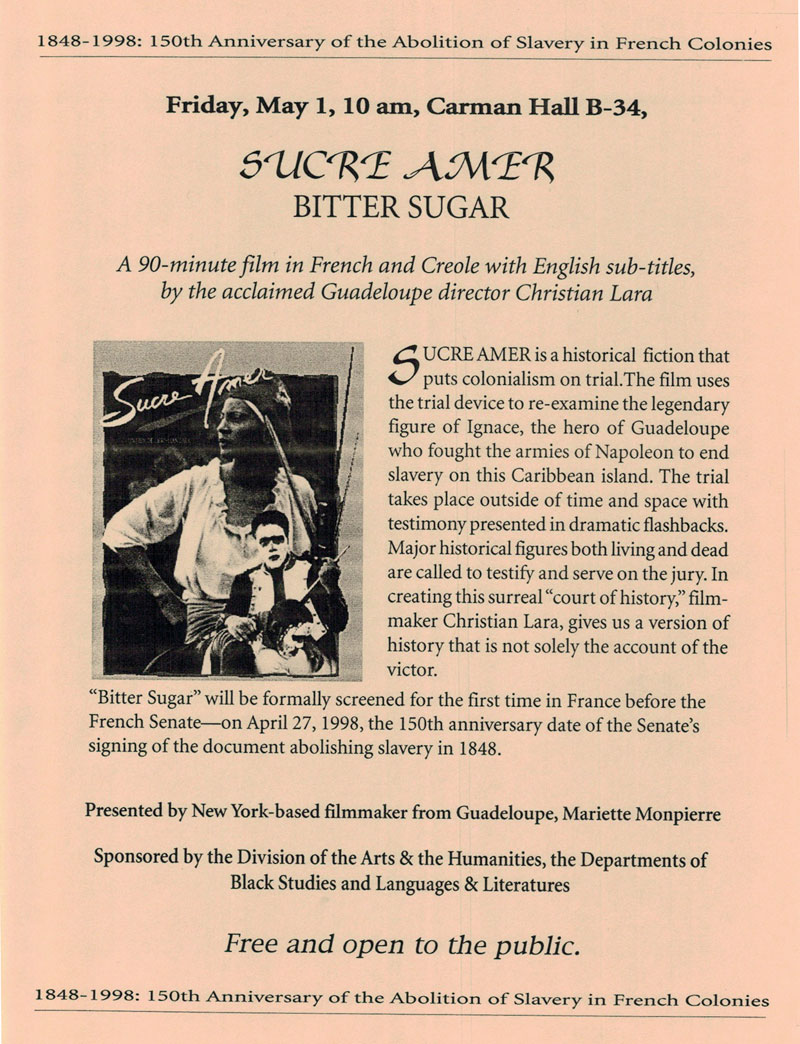 - Screening of Sucre Amer, film by Christian Lara, to commemorate the 150th anniversary of the abolition of slavery in French colonies; presented by producer and filmmaker, Mariette Monpierre, 1 May 1998. [flyer JPG]