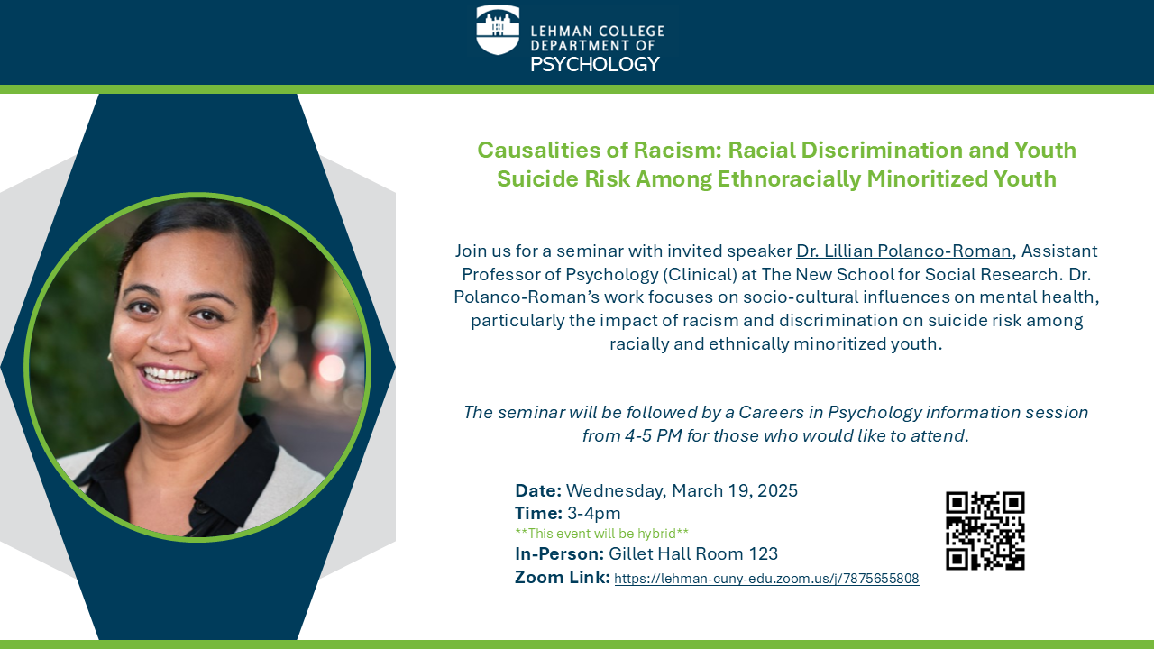 Join us for a seminar with invited speaker Dr. Lillian Polanco-Roman, Assistant Professor of Psychology (Clinical) at The New School for Social Research. Dr. Polanco-Roman’s work focuses on socio-cultural influences on mental health, particularly the impact of racism and discrimination on suicide risk among racially and ethnically minoritized youth.
