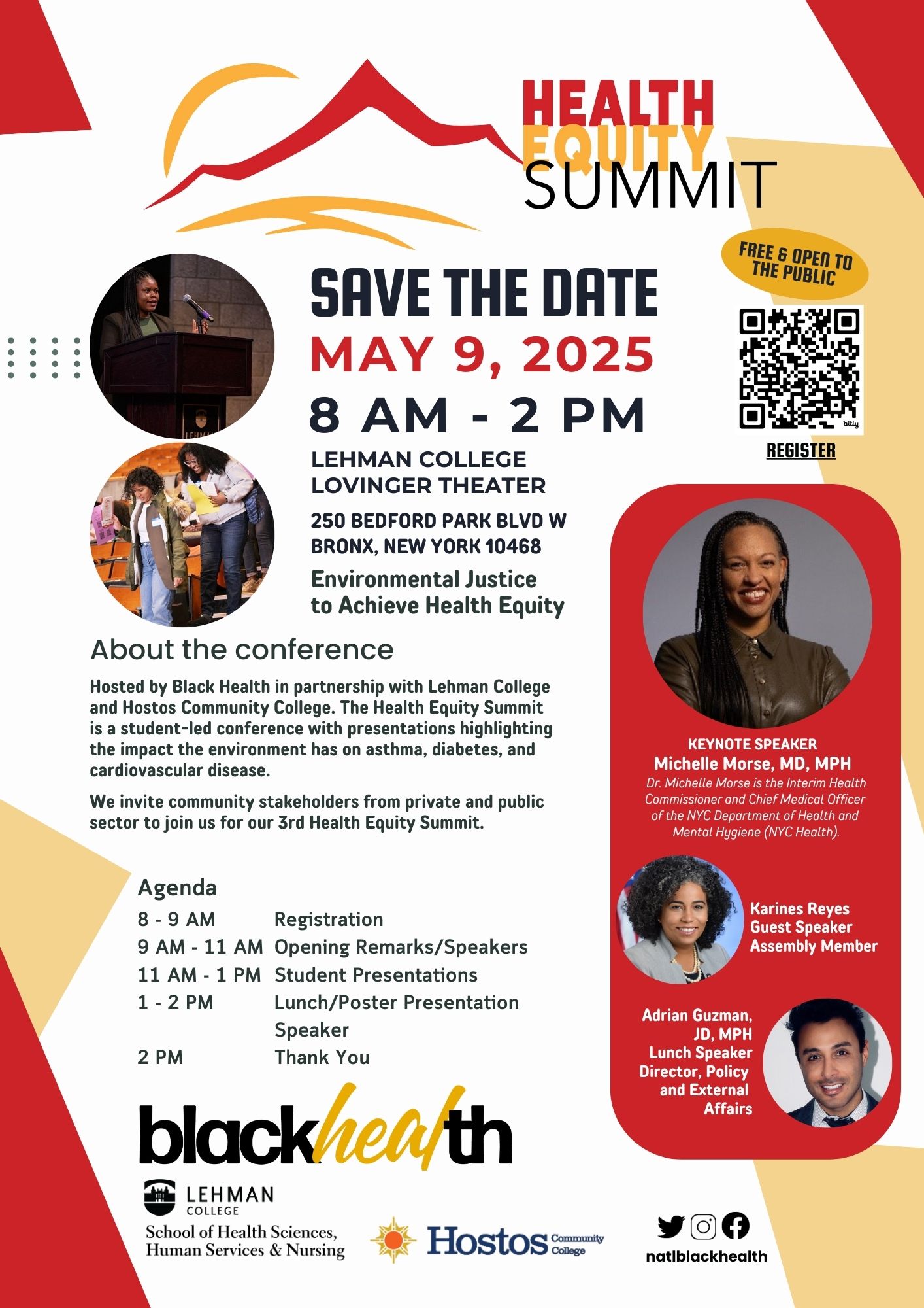 Hosted by Black Health in partnership with Lehman College and Hostos Community College, the Health Equity Summit is a student-led conference with presentations highlighting the impact the environment has on asthma, diabetes and cardiovascular disease.