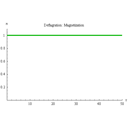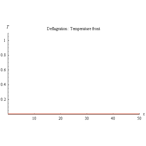 well n that is related to the magnetization. 1. The temperature is quickly raised at the left end of the sample from zero up to some value while the right end is thermally isolated. The heat propagates from left to right, then the thermal runaway (ignition) occurs somewhere, then the deflagration front propagates from the ignition point, resulting in a complete burning a) Wf=3. The temperature is raised up to the flame temperature Tf on the left. In this case the runaway occurs immediately at the left end and the front moves to the right: Temperature, Metastable population b) Wf=3. The temperature is raised up to 0.3Tf on the left. The runaway occurs after ignition time at some distance from the left end: Temperature, Metastable population c) Wf=10 - deflagration is slower, ignition time is longer. Thus the heat penetrates deeper into the sample before ignition occurs. The temperature is raised up to 0.55Tf on the left, ignition occurs around x=15: Temperature, Metastable population d) Wf=10. The temperature is raised up to 0.5Tf on the left, ignition occurs at the right end: Temperature, Metastable population 2. In the initial state the sample is locally overheated in the middle with a Gaussian temperature profile of some height and some width. The temperature at the boundaries is zero. Then the system evolves in time. At first the heat spreads to left and right, the height of the temperature profile decreases and the width increases. On the other hand, the heat is released in the middle of the sample because of burning that competes with heat diffusion. There are two scenarios: (i) Subcritical: The heat diffusion prevails and the local overheating disappears with time; (ii) Supercritical: The heat release prevails, ignition occurs in the middle, and the deflagration front propagates to the ends. What happens depends on the height and width of the initial temperature profile, as well as on other parameters. Below the slightly supercritical scenario is shown: |