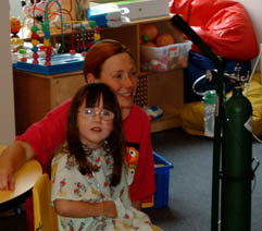 | Bet you didn't think that when kids are in the hospital, they get to go to magic shows, did you? I sure didn't, but here I am, in the playroom and about to watch some magic happen. If you look really, really hard, you'll see that I'm receiving Oxygen through some tiny tubes that go into my nostrils. These tubes don't hurt at all, and the Oxygen that goes through them makes it easy for me to breathe. That's my mom next to me, and she thinks its magic that I feel so much better today! |