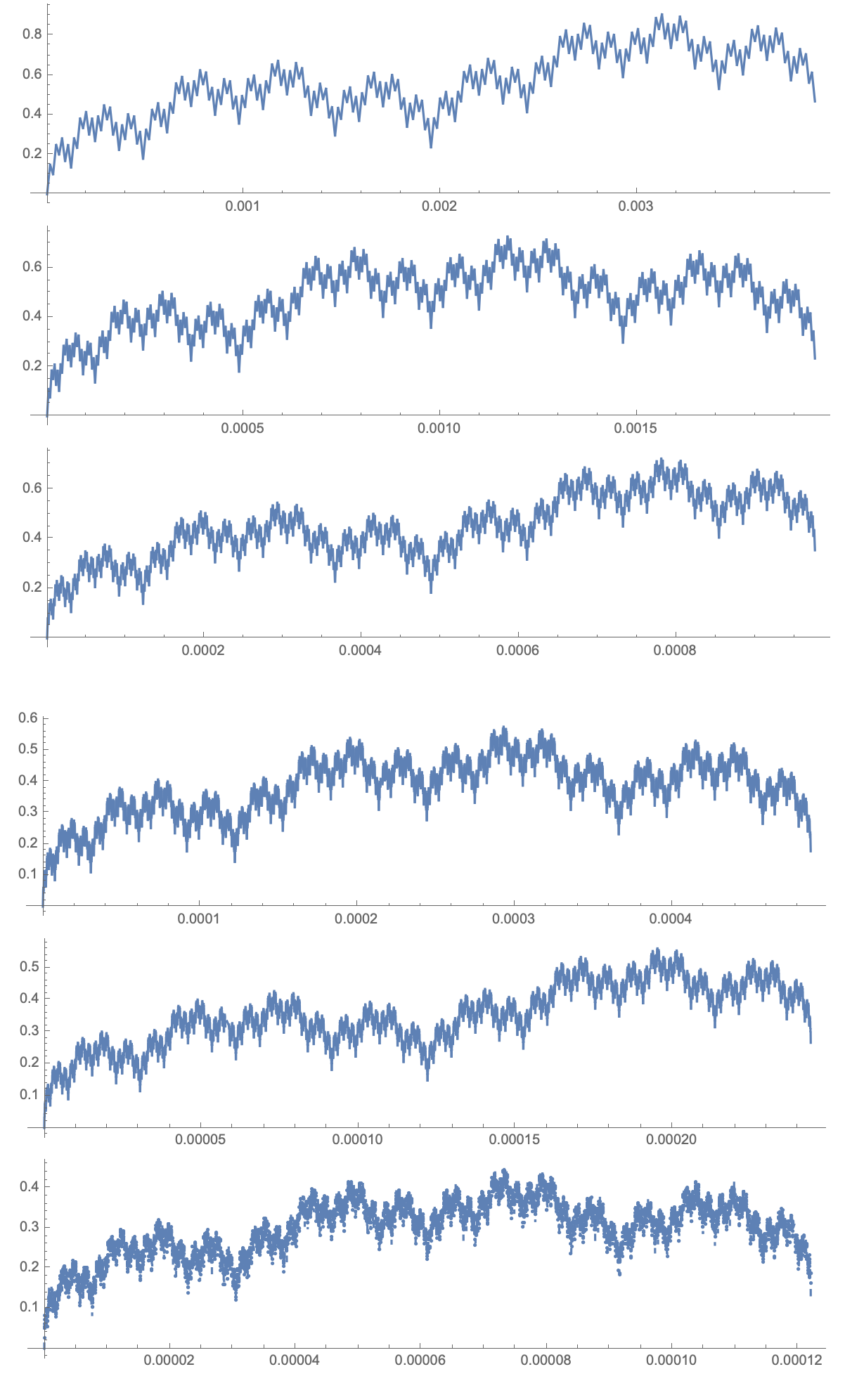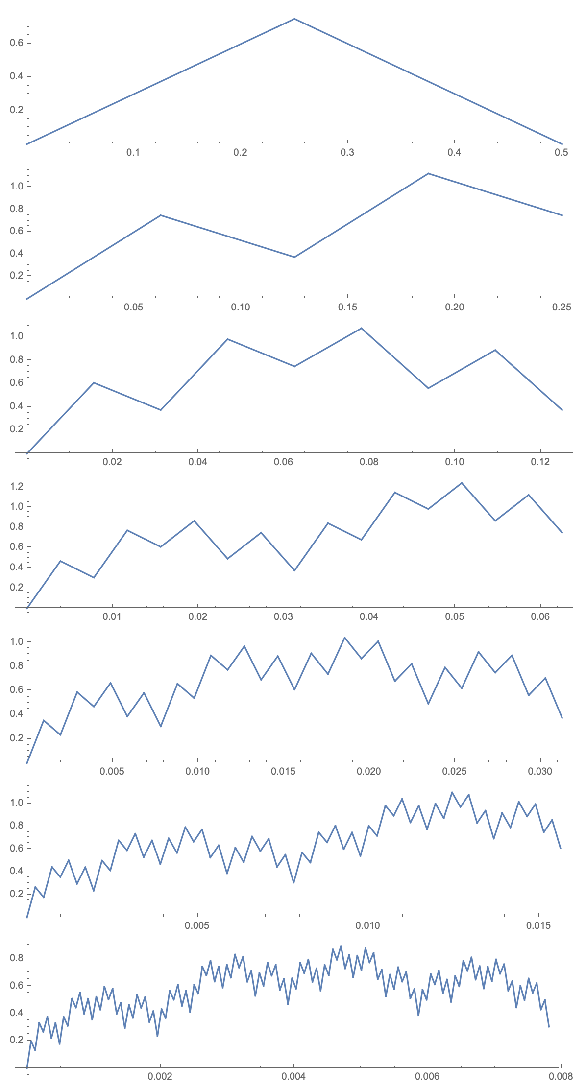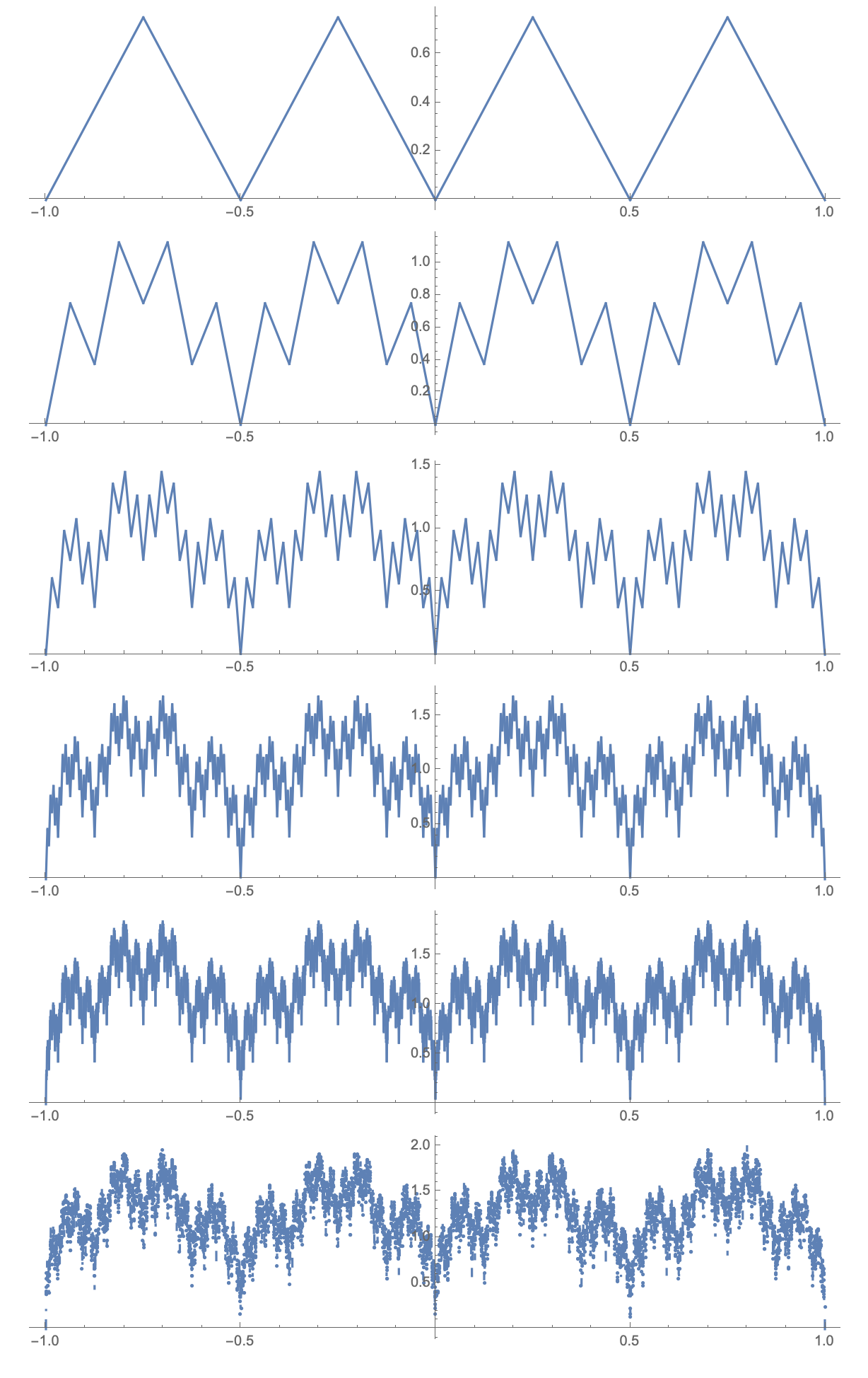 • Some plots of partial sums $F_N(x)=\sum_{n=1}^N \left(\frac{3}{4}\right)^n\varphi(4^n x)$, such that $f(x)=\lim_{N\to+\infty} F_N(x)$ is the everywhere continuous but nowhere differentiable function from Video 7 are below, click to open image separately:
