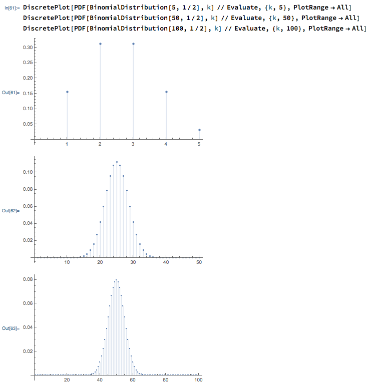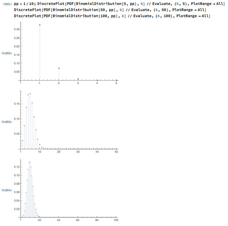 • Histograms with $n=5,50,100$ and $p=\frac12,\frac14,\frac{1}{10}$. Click on the image to make it larger, and use the linkĀ above for an interactive way of visualizing this.