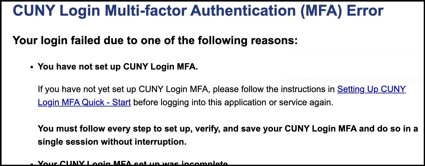 When logging into CUNYfirst, Brightspace, Navigate, Lehman 360, or any other system with your CUNY Login Account credentials, you may encounter the following message: