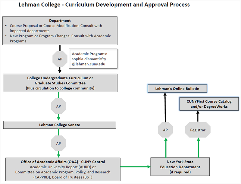 Curriculum development at Lehman College is a detailed approval process involving all stakeholders to guarantee effective and successful implementation. Course proposals, course modifications, new programs, program changes, all go through Academic Programs, and then the College Undergraduate Curriculum or Graduate Studies Committee, the Senate, and the Office of Academic Affairs, before finally appearing in the Lehman Online Bulletin and CUNYfirst Course Catalog and/or Degree Works.