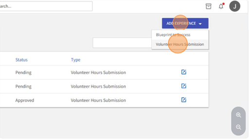 - Add Experience: In the Experiences section, click "Add Experience" and select "Volunteer Hours Submission."
