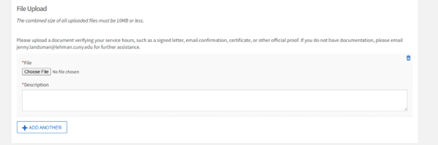 - As part of the process, you will be asked to upload supporting documentation. Please upload a signed letter, email, or other document verifying your service hours. You can view sample documents here: https://bit.ly/4ptDwr0.